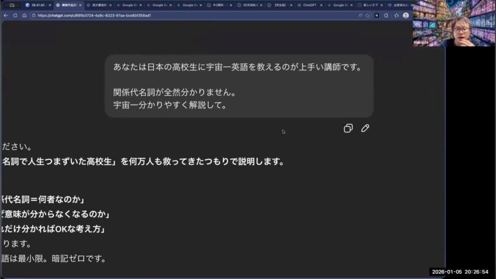 関係代名詞などの難しい英文法も、AIに「宇宙一分かりやすく教えて」と指示することで、ネイティブの感覚に基づいたシンプルな解説を受けることができます。