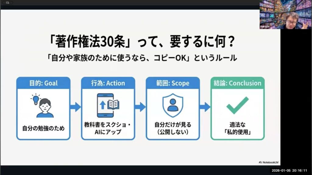 AIに参考書や教科書の内容を読み込ませる際は、「自分自身の学習のため」という私的利用の範囲に留めることが大切です。