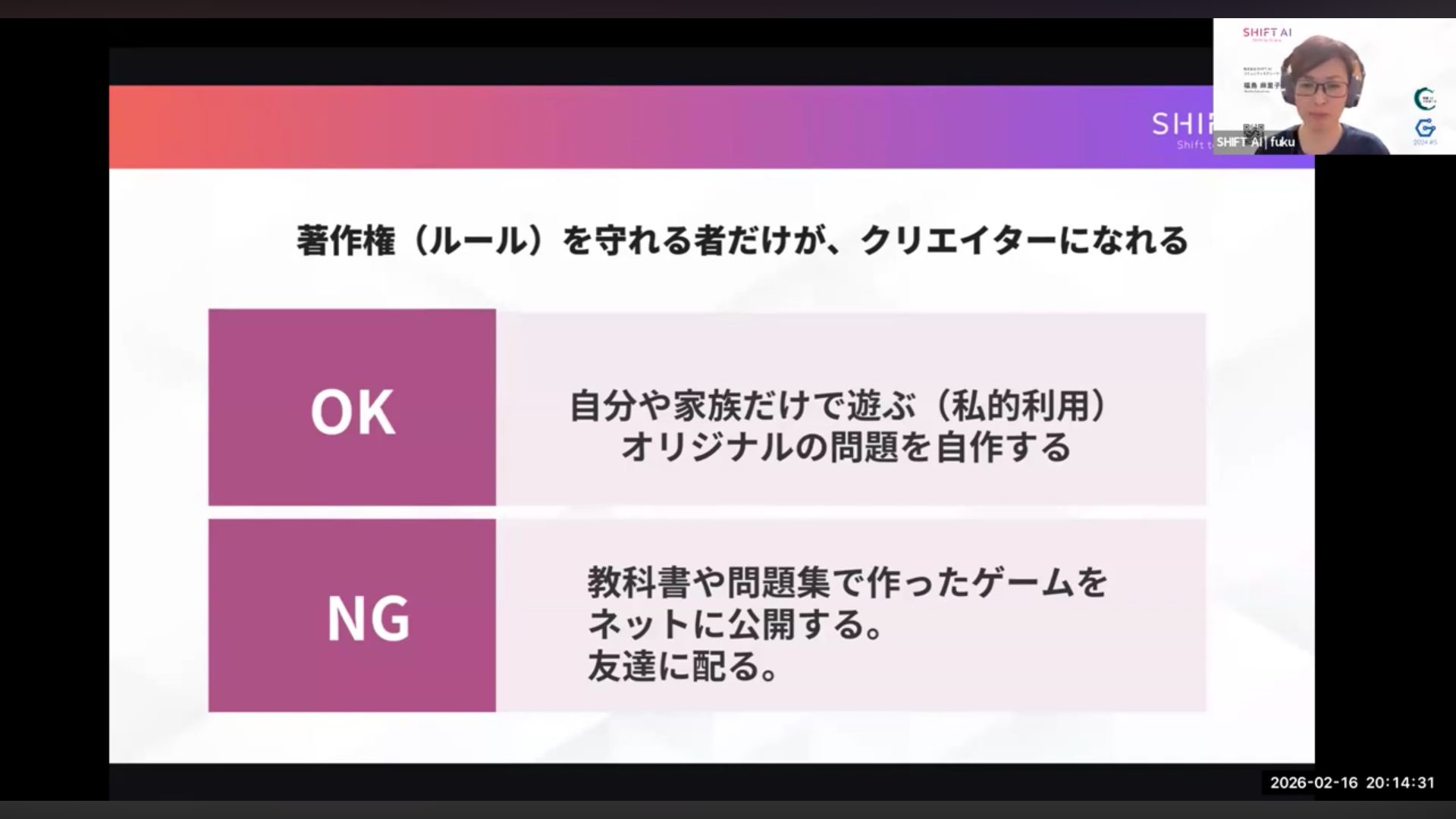 | ウェビナー名 | オリジナル学習ゲーム完成 AIを使って楽しく学ぶ方法|SHIFT AI Junior |