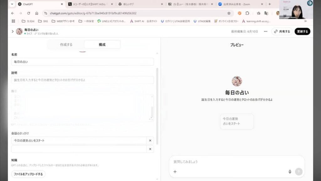 ウェビナーの本編では、実際にしぃーさんが「裏側の設定画面」を開き、どのように指示を出してオリジナルの占いGPTsを作成したか、そのプロンプト(指示文)の中身まで詳細に解説しています。