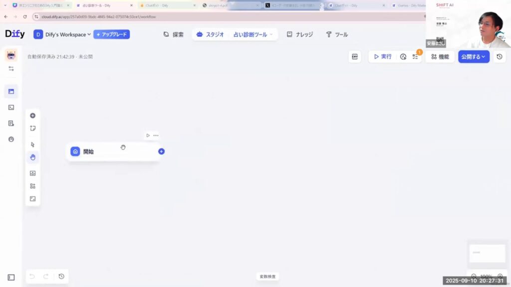 Difyでのアプリ開発は、画面上に用意された「ブロック(ノード)」を配置し、それらを線で繋いでいくだけで進みます。