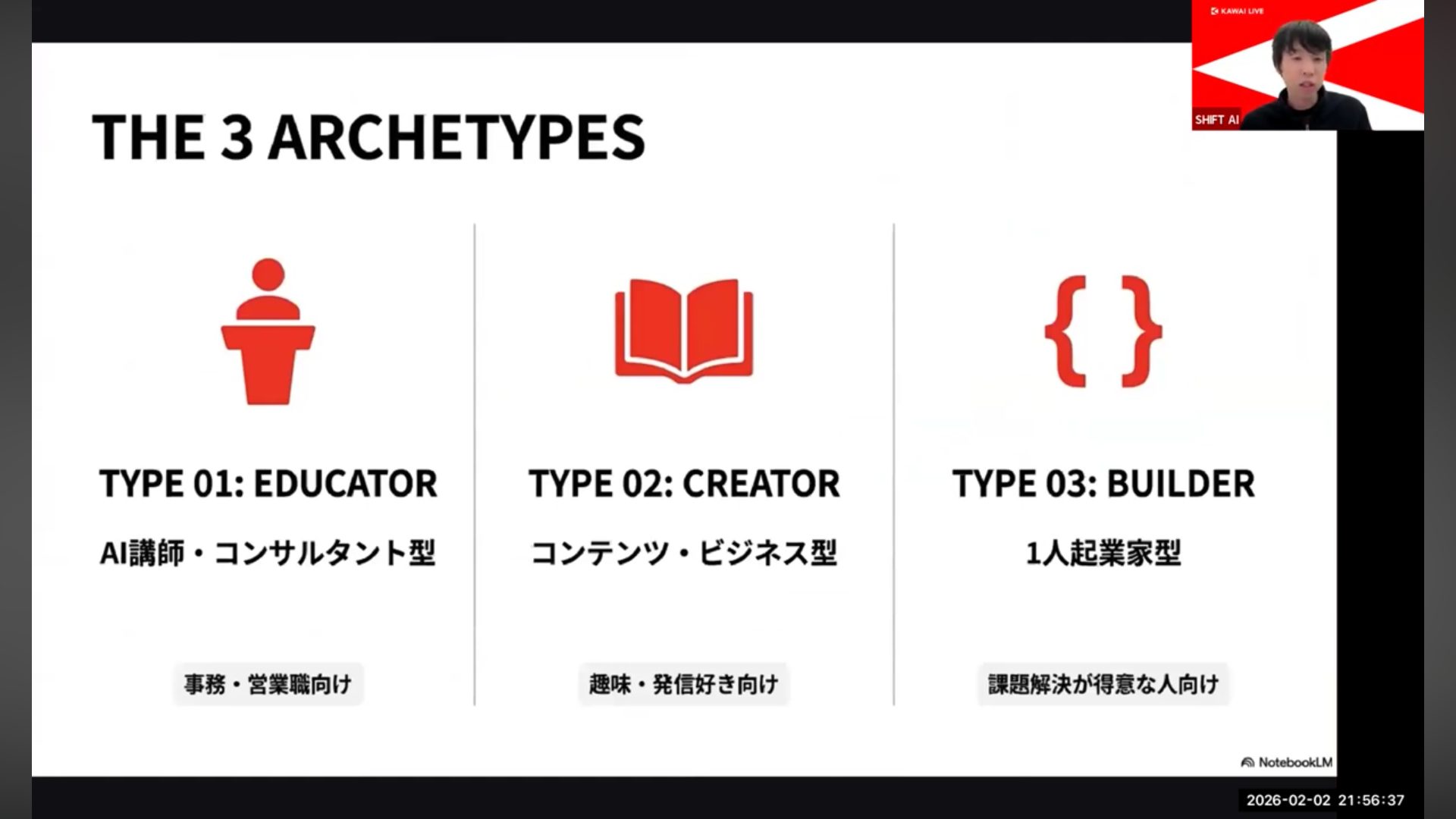 ウェビナーではここで紹介した内容に加え、実践で使えるプロンプトの具体的なテンプレートや、各タイプ別の詳細な収益モデル、発信力・ビジネス力をどう高めるかまで、より応用的・実践的な内容が解説されています。