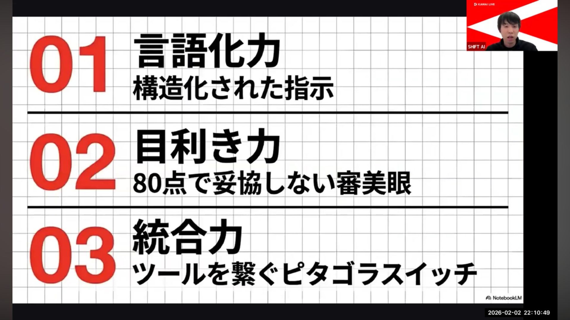 - AI指揮者に必要な3つのスキル(言語力・目利き力・統合力)