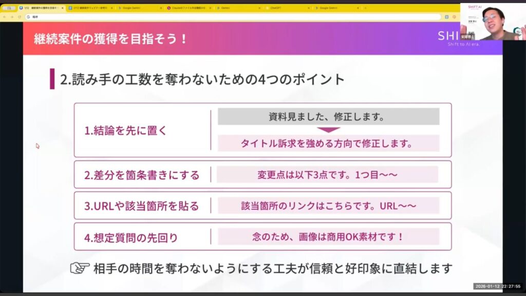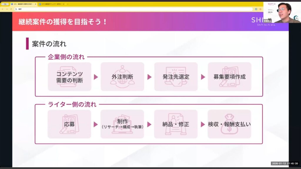 今回は、利用者数No.1*のAI活用コミュニティ「SHIFT AI」で開催された会員向けオンラインウェビナー「AIライターウェビナー 継続案件の獲得を目指そう!クライアントとの信頼構築に必要な考え方」の内容の一部を特別公開します。