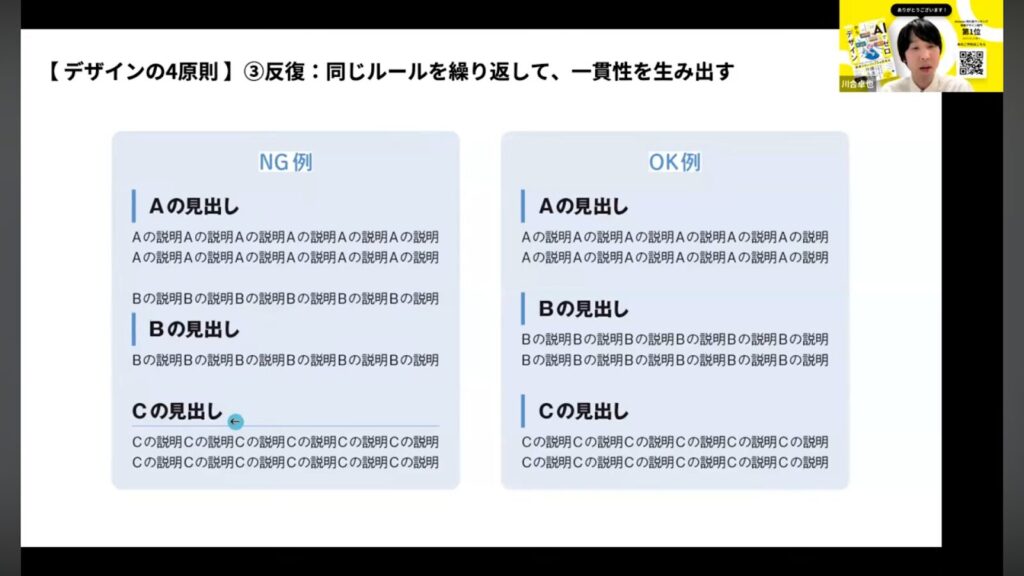 「反復」は、デザイン上のルール(色、フォント、装飾など)を繰り返すことです。