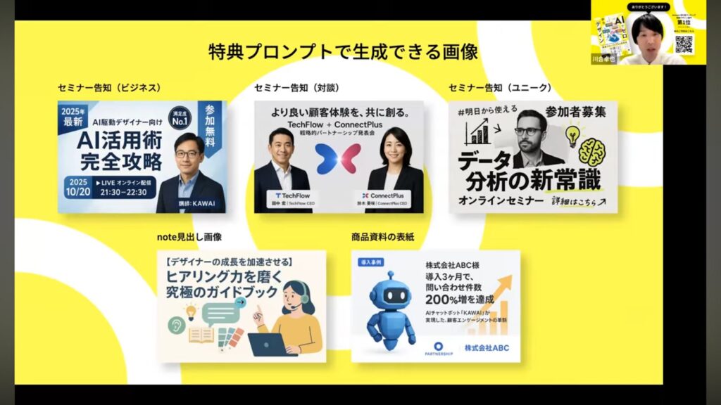 ウェビナーでは、「メインコピー」「サブコピー」「日時」「アイコン」といった要素を定義し、それをプロンプトに組み込む方法が解説されました。