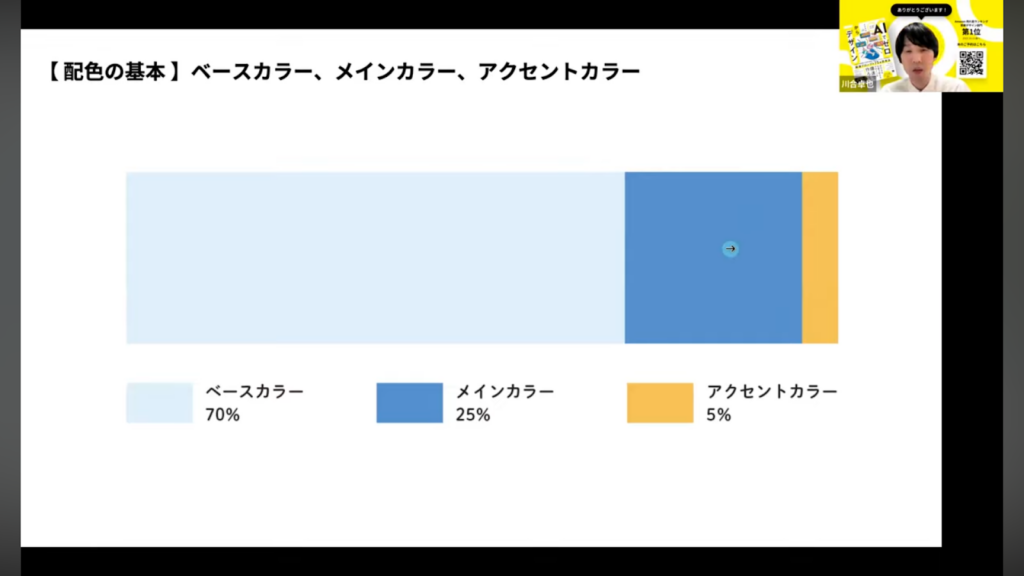 配色は「ベースカラー(70%)」「メインカラー(25%)」「アクセントカラー(5%)」の3色で構成するのが基本です。